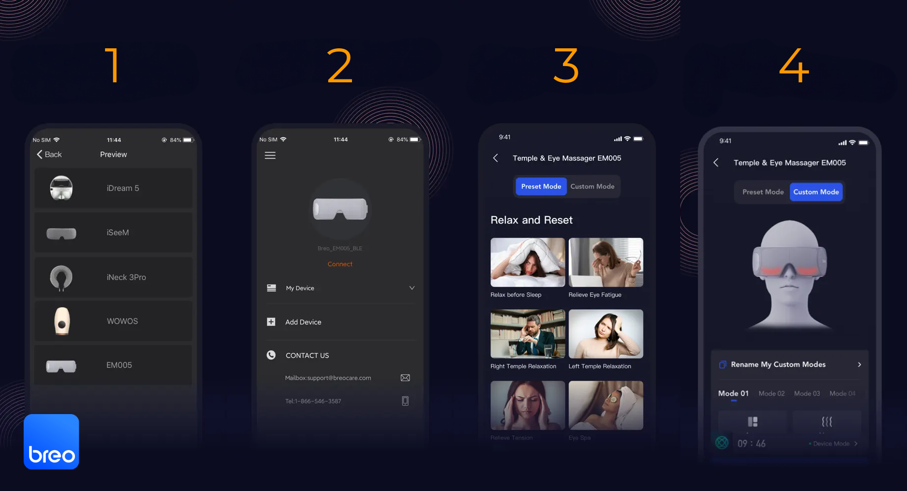 Masážny prístroj na oblasť očí a spánkov breo EM005 bol vytvorený s cieľom riešiť problémy dnešného moderného sveta. Pomáha bojovať proti bolesti, zmierňuje namáhanie očí a pomáha relaxovať a zaspať. Ideálna voľba pre všetkých, ktorí trávia veľa času sedením pred obrazovkou, často cestujú, majú problémy so zaspávaním alebo trpia bolesťami hlavy. Vypnite, aby ste mohli zapnúť – zapnite, aby ste mohli vypnúť!